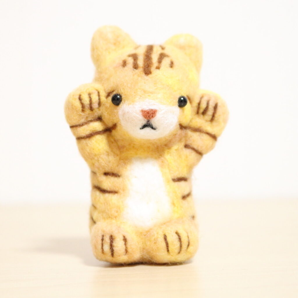羊毛フェルト作品135 茶トラ招き猫 作品 2021.11.042023.10.05 茶トラ招き猫重さ : 12.2 gサイズ幅 : 5.3 cm奥行 : 6.4 cm高さ : 7.6 cm目に プラスチックアイ を使っています。 後ろからの画像は続きにあります。 招き猫ポーズの「茶トラ」ちゃんです。 額のM字の模様がチャームポイント きっと幸せを招いてくれるはず