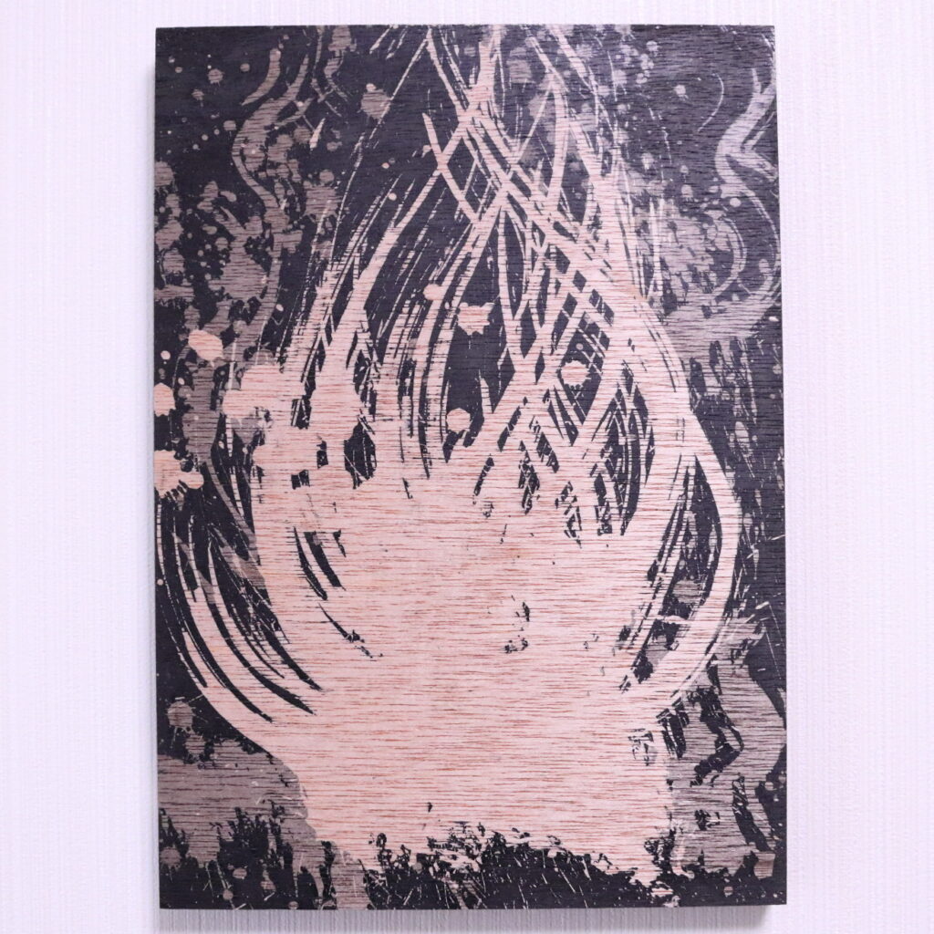 蝋で描き、墨を重ね、蝋を削り落とすことで姿が浮かび上がる